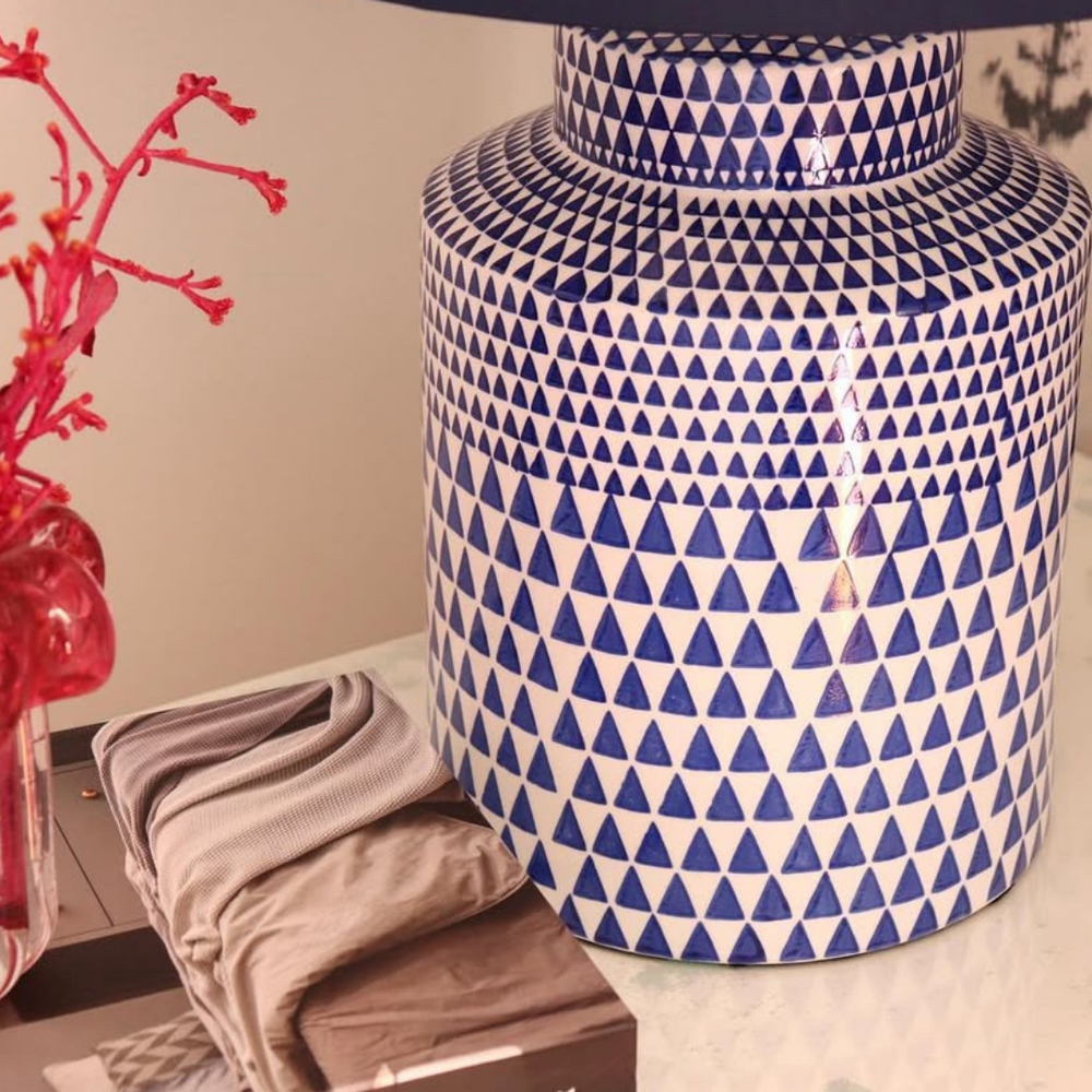The Hampton table lamps are sculpted from lustrous fine porcelain, their surfaces alive with a constellation of hand-painted blue pyramids. Each geometric motif sharpens the lamp’s silhouette into something both architectural and poetic—an interplay of precision and ornament. The porcelain body carries a quiet radiance, while the pyramids interrupt the calm with a rhythm of cobalt facets, turning the lamp into a luminous totem. More than a source of light, it is an artifact of meticulous craft, where form and detail conspire to create an atmosphere at once rarefied and intimate.